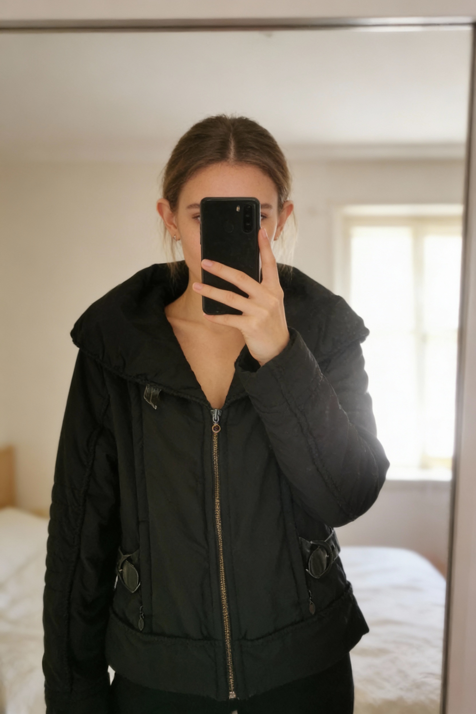 Blouson debout, face à la caméra, dans une chambre à la lumière douce, avec une lumière naturelle filtrant par la fenêtre.