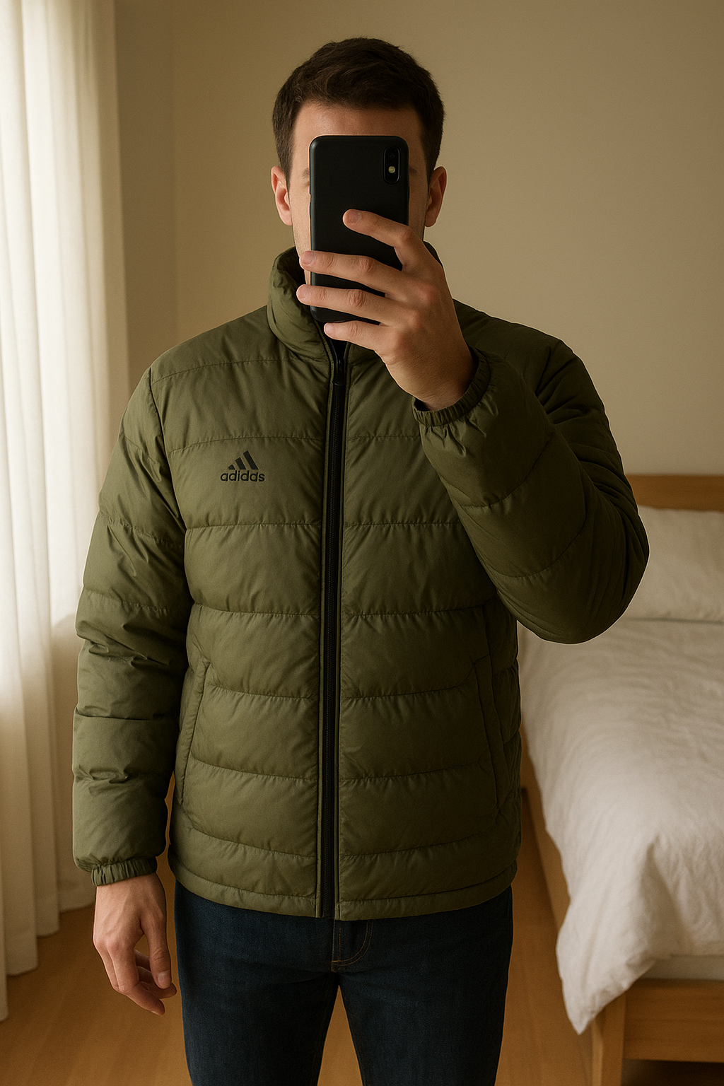 Blouson adidas debout, face à la caméra, dans une chambre à la lumière douce, avec une lumière naturelle filtrant par la fenêtre.