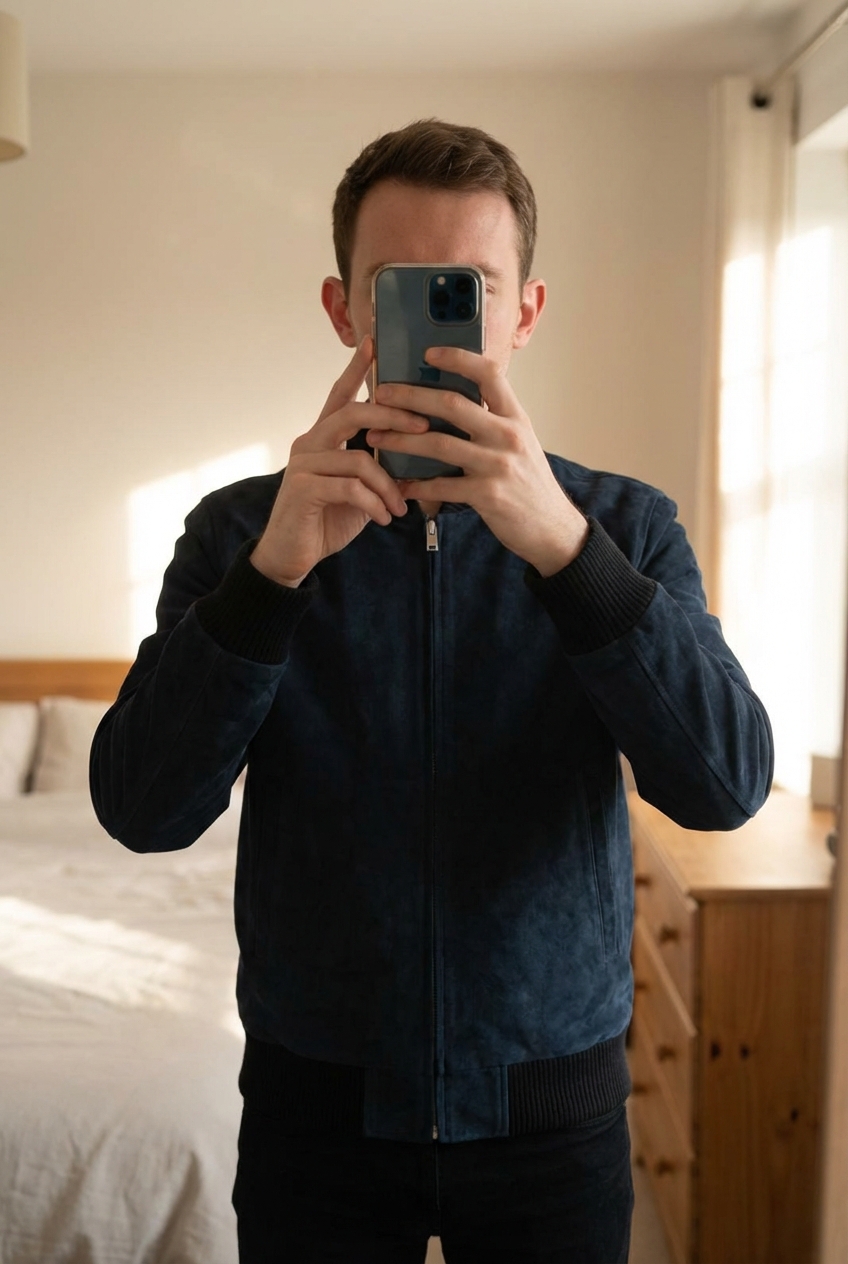 Une personne en Blouson facon teddy sandro Homme daim TM neuf debout, face à la caméra, avec une silhouette fine, dans une chambre à la lumière douce, avec une lumière naturelle filtrant par la fenêtre.