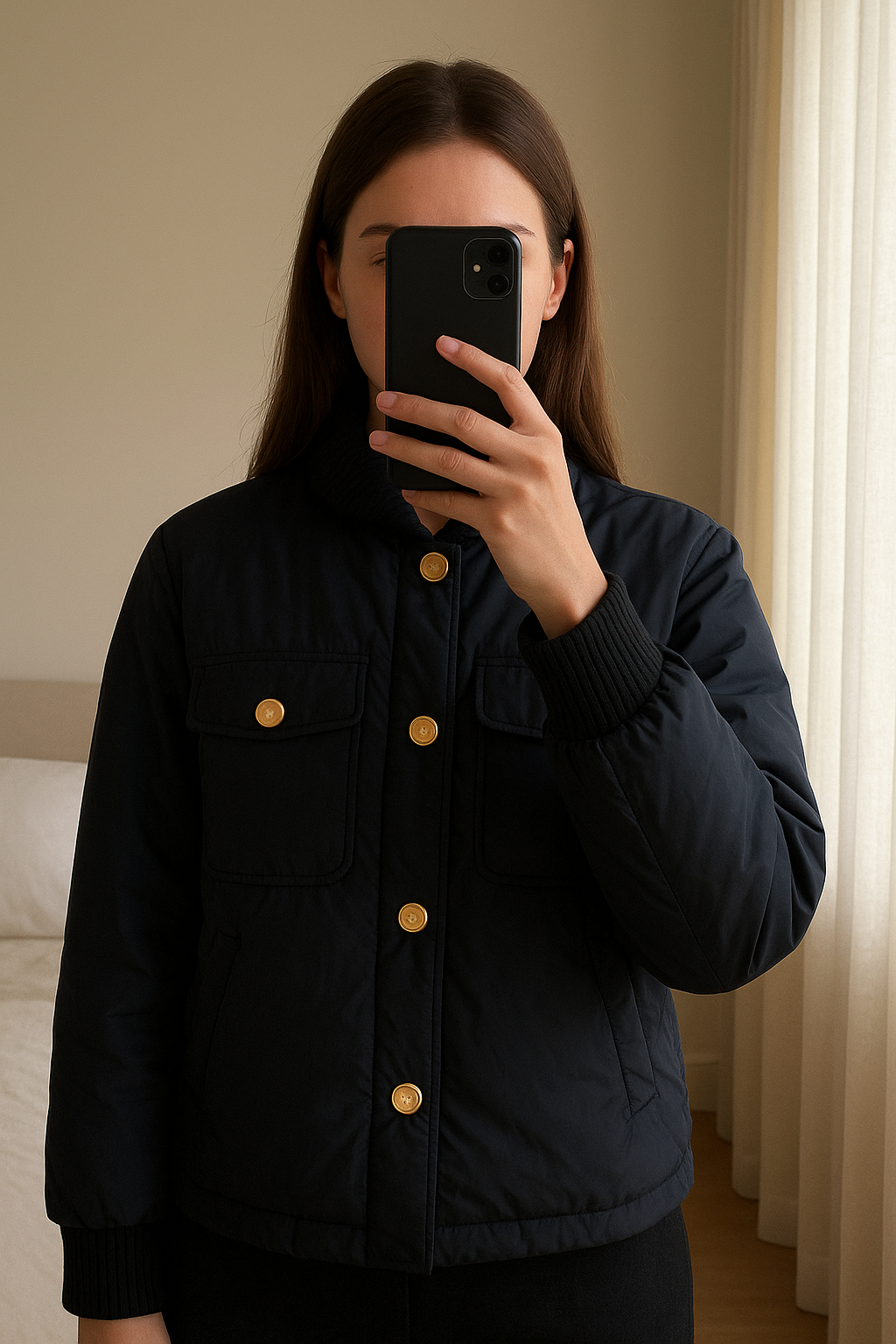 Blouson femme Sandro marine T36 neuf debout, face à la caméra, dans une chambre à la lumière douce, avec une lumière naturelle filtrant par la fenêtre.
