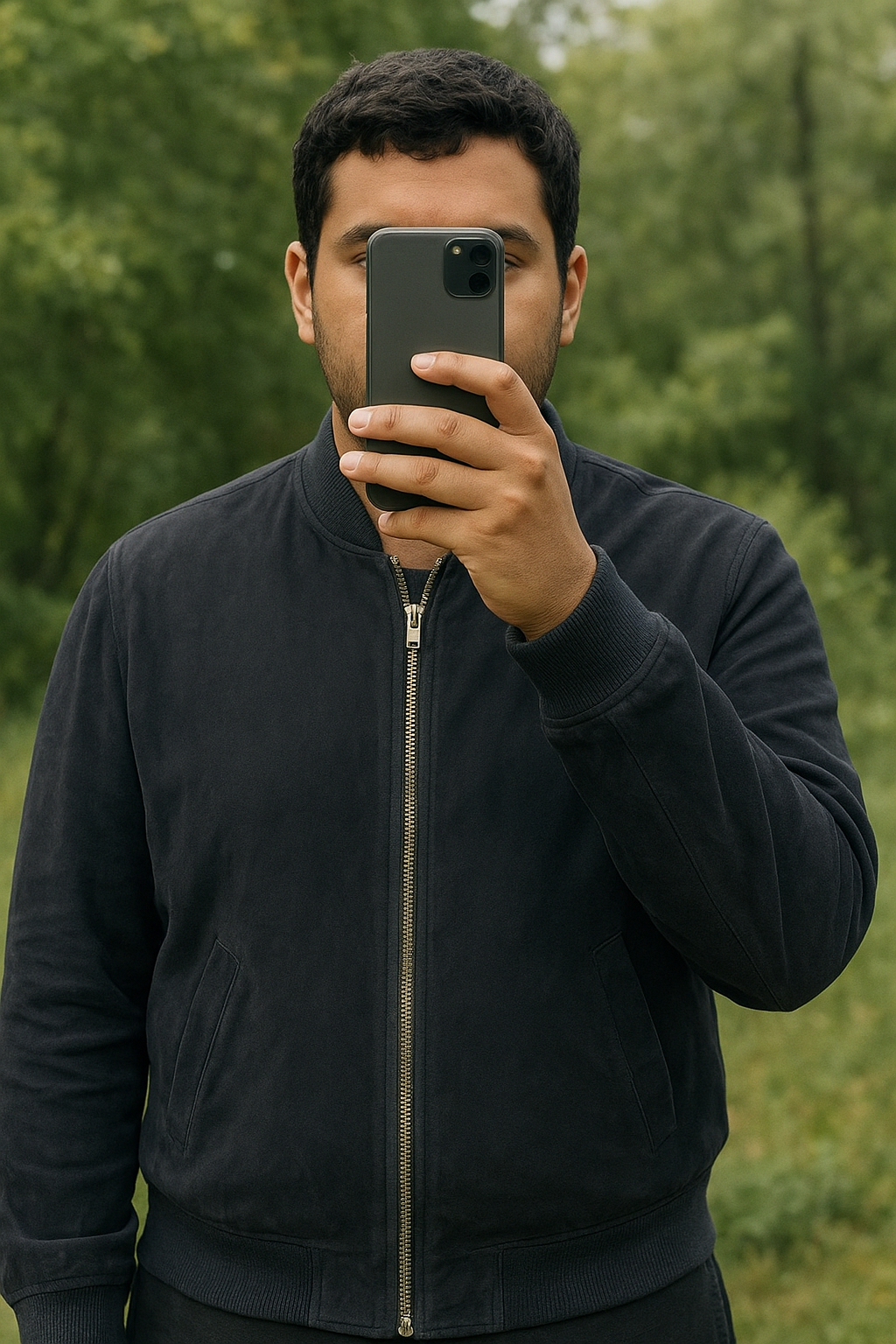 Une personne en Blouson Mango Homme - Bleu marine - Taille XL debout, face à la caméra, avec une silhouette légèrement plus ronde, en extérieur, dans un cadre naturel entouré de verdure et de lumière douce.