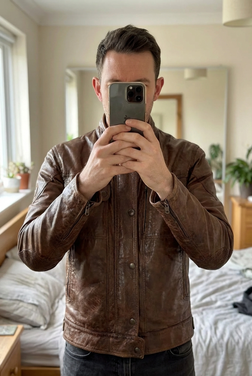 Blouson moto Matchless cuir marron patiné L debout, face à la caméra, dans une chambre à la lumière douce, avec une lumière naturelle filtrant par la fenêtre.