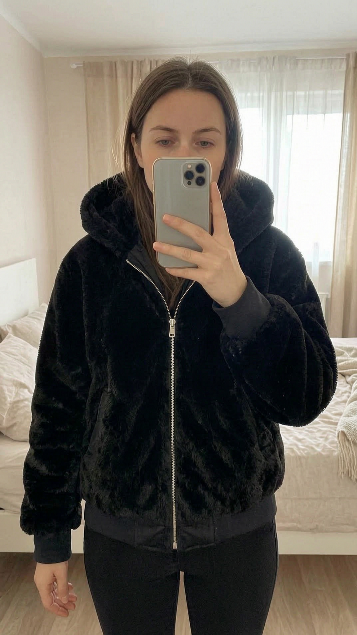 Blouson réversible femme debout, face à la caméra, dans une chambre à la lumière douce, avec une lumière naturelle filtrant par la fenêtre.