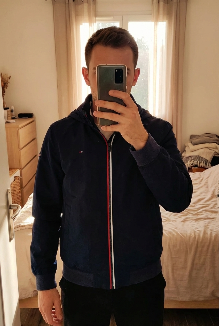 Blouson Tommy Hilfiger 🍒 debout, face à la caméra, dans une chambre à la lumière douce, avec une lumière naturelle filtrant par la fenêtre.