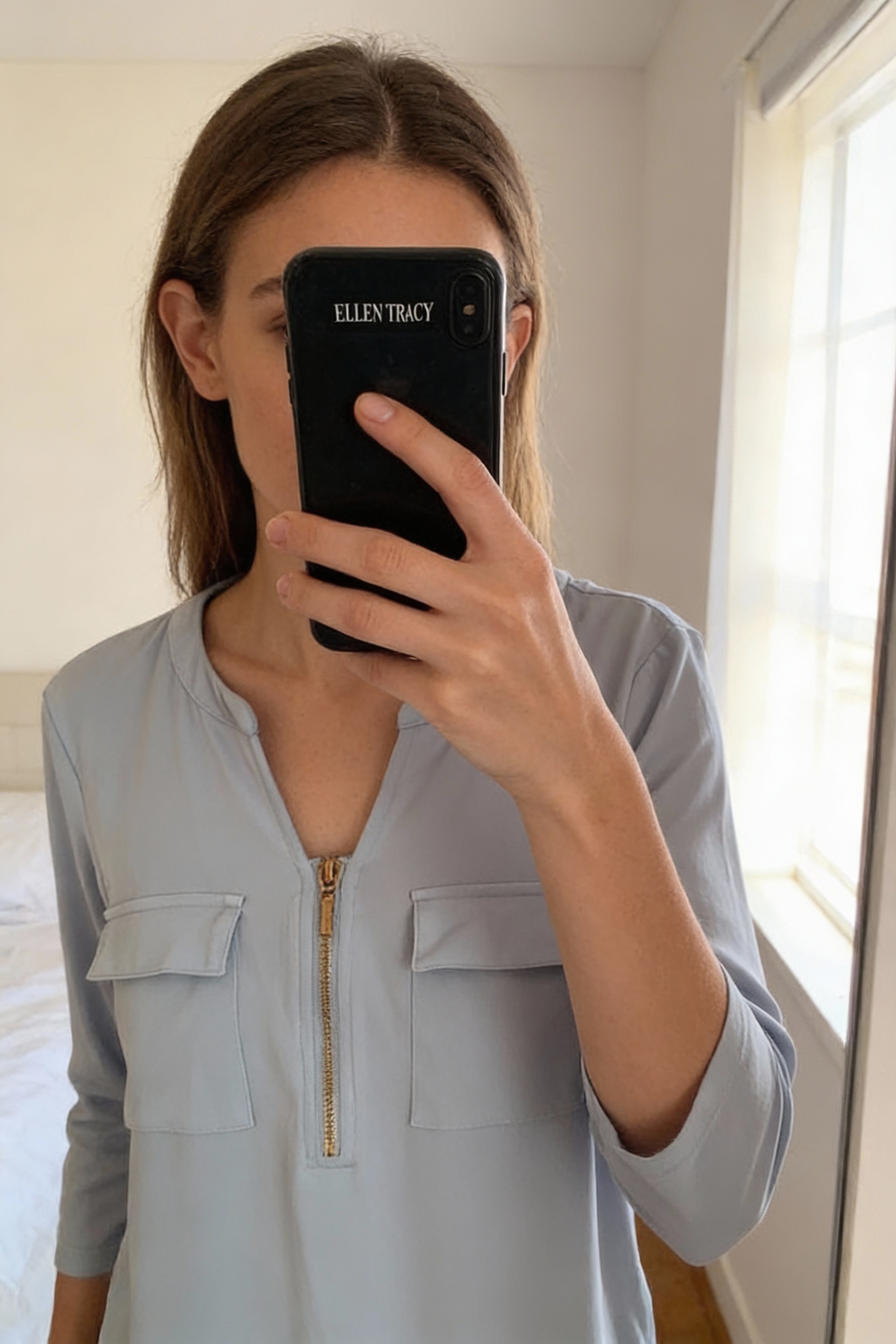 Blue top debout, face à la caméra, dans une chambre à la lumière douce, avec une lumière naturelle filtrant par la fenêtre.