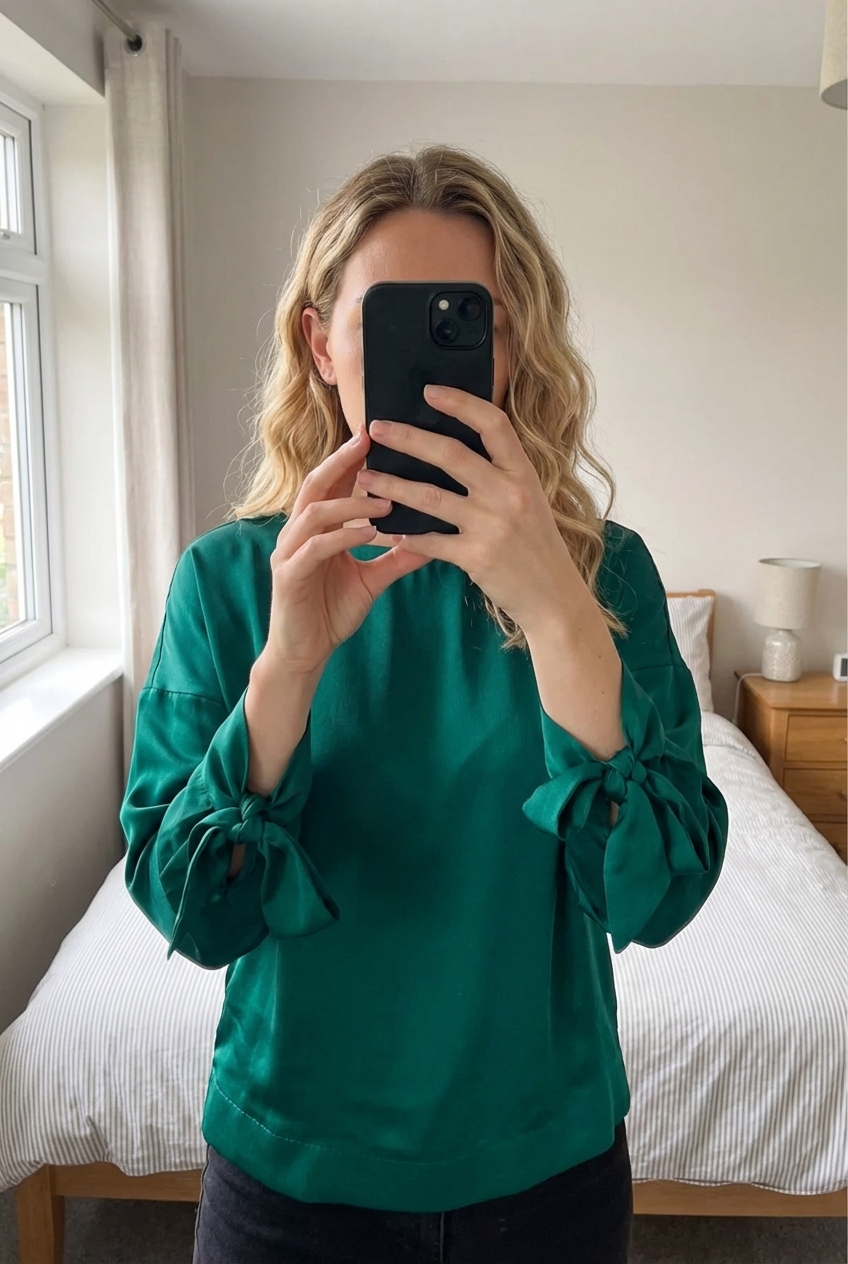 Una persona con Blusa seda mango de pie, mirando a la cámara, con tipo de cuerpo delgado, en un dormitorio con luz suave y natural filtrándose por la ventana.