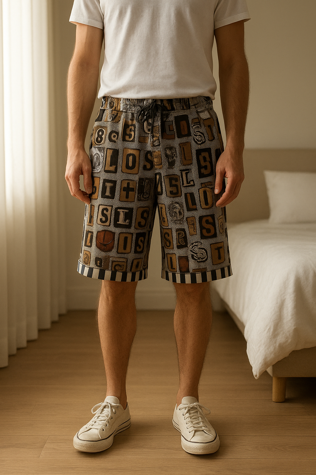 Boardshort lost taille 32 debout, face à la caméra, dans une chambre à la lumière douce, avec une lumière naturelle filtrant par la fenêtre.