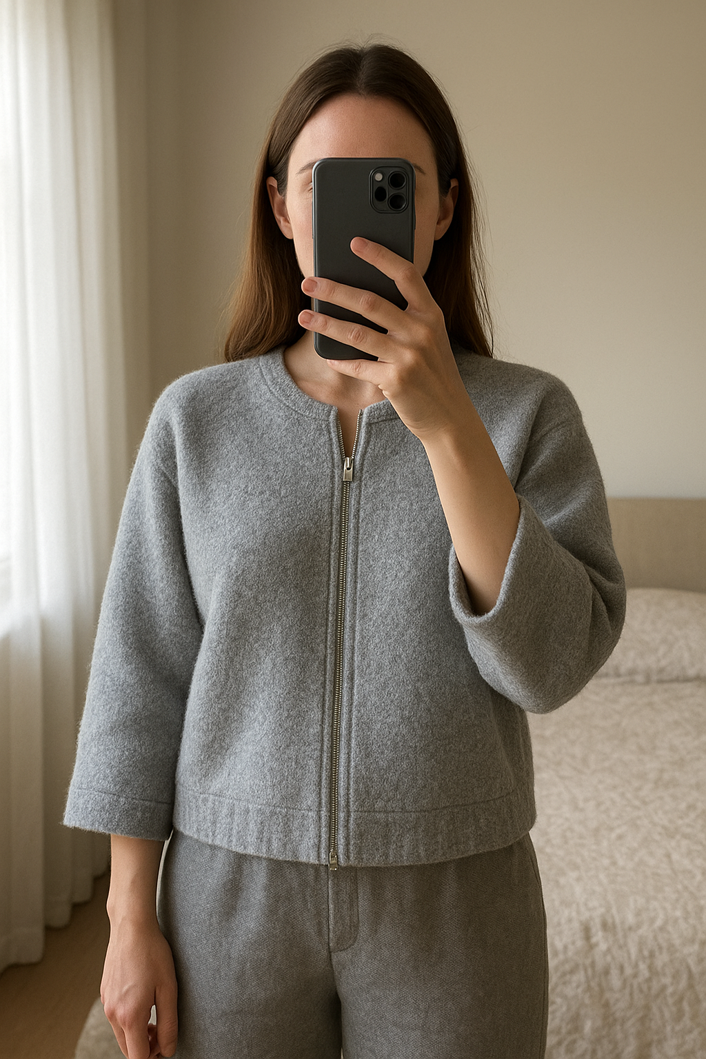 bomber zara debout, face à la caméra, dans une chambre à la lumière douce, avec une lumière naturelle filtrant par la fenêtre.