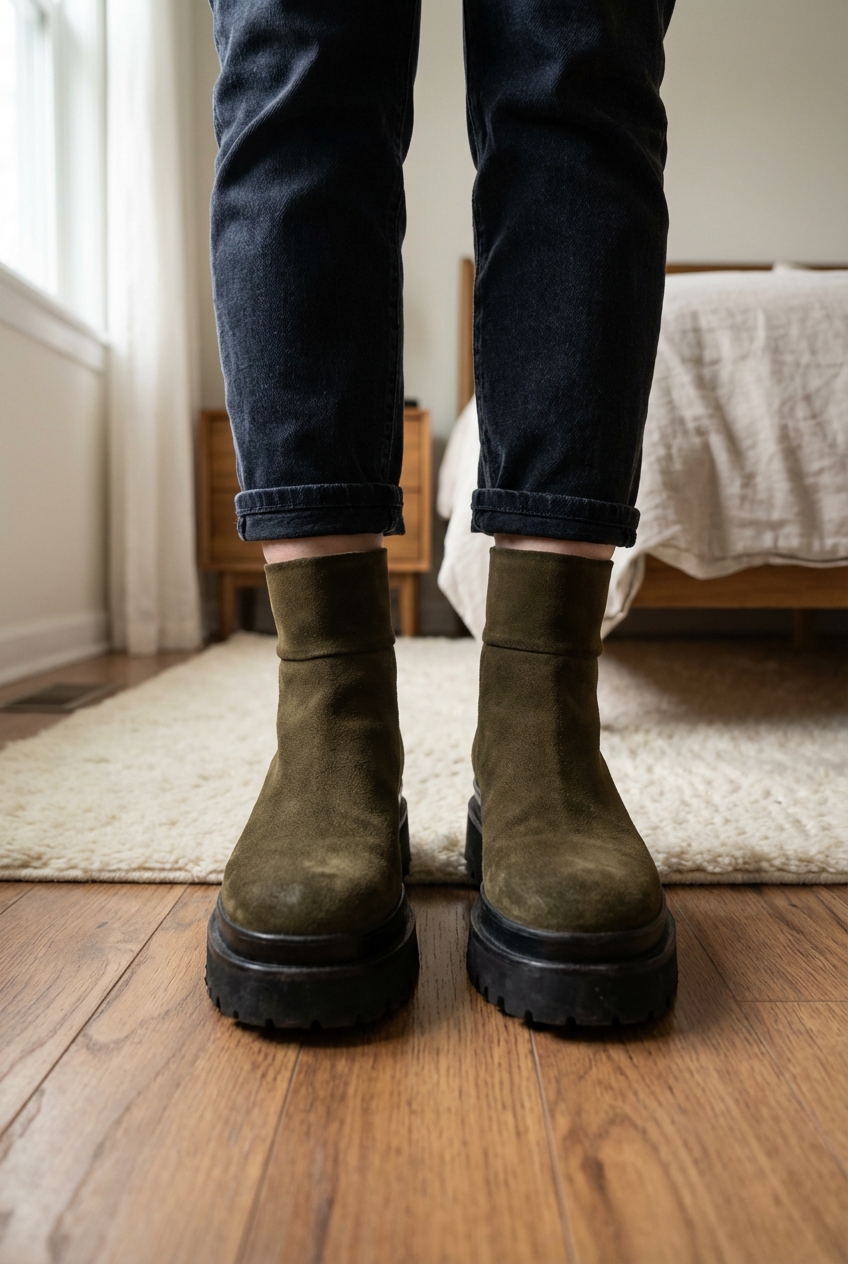 Boots kaki de pie, mirando a la cámara, en un dormitorio con luz suave y natural filtrándose por la ventana.
