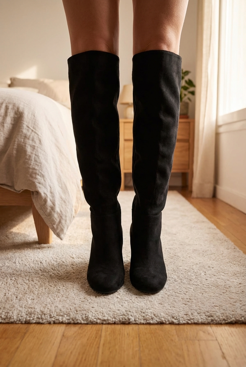 Bottes noires H&M debout, face à la caméra, dans une chambre à la lumière douce, avec une lumière naturelle filtrant par la fenêtre.