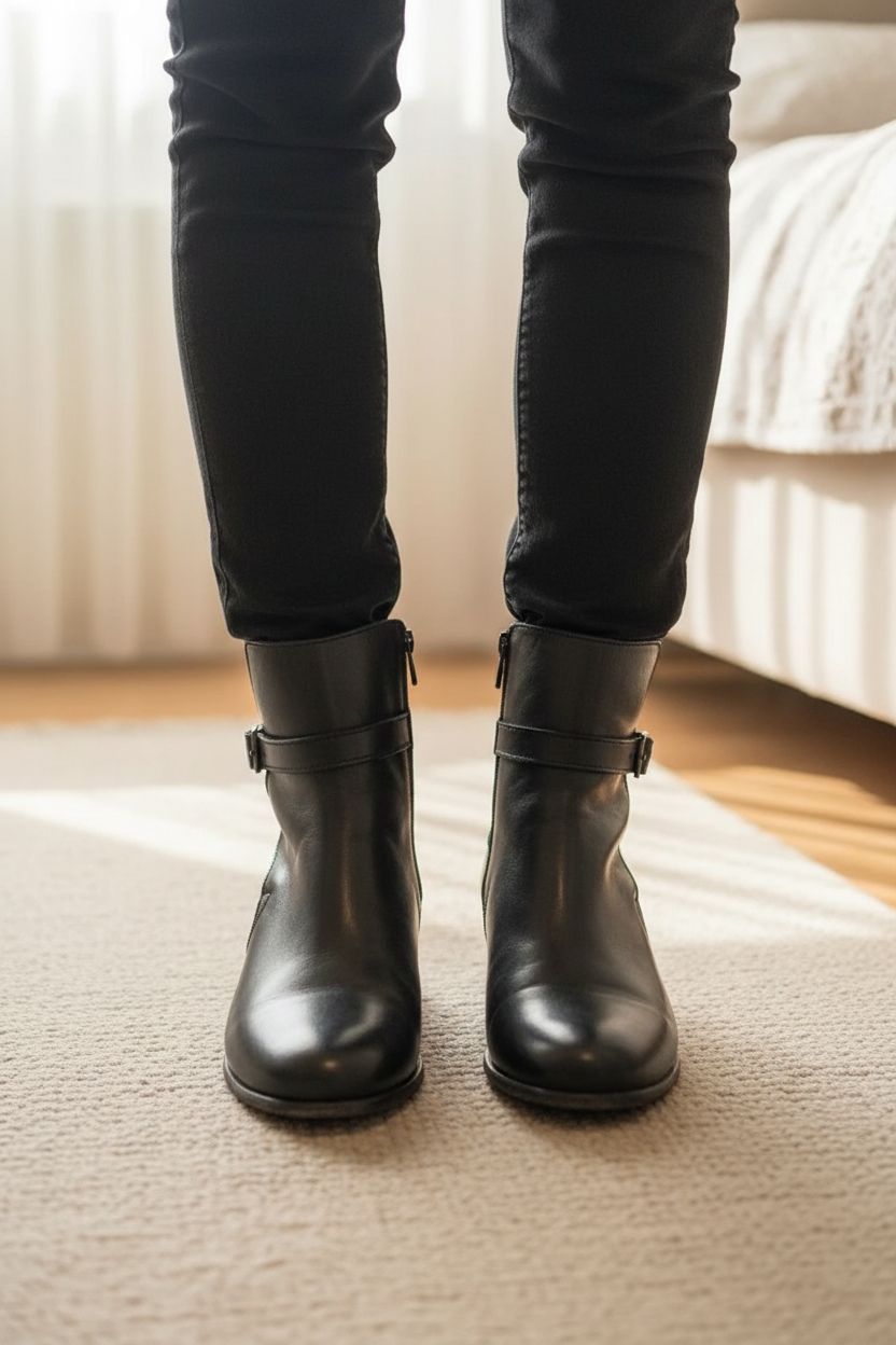 Bottines 36 noir debout, face à la caméra, dans une chambre à la lumière douce, avec une lumière naturelle filtrant par la fenêtre.