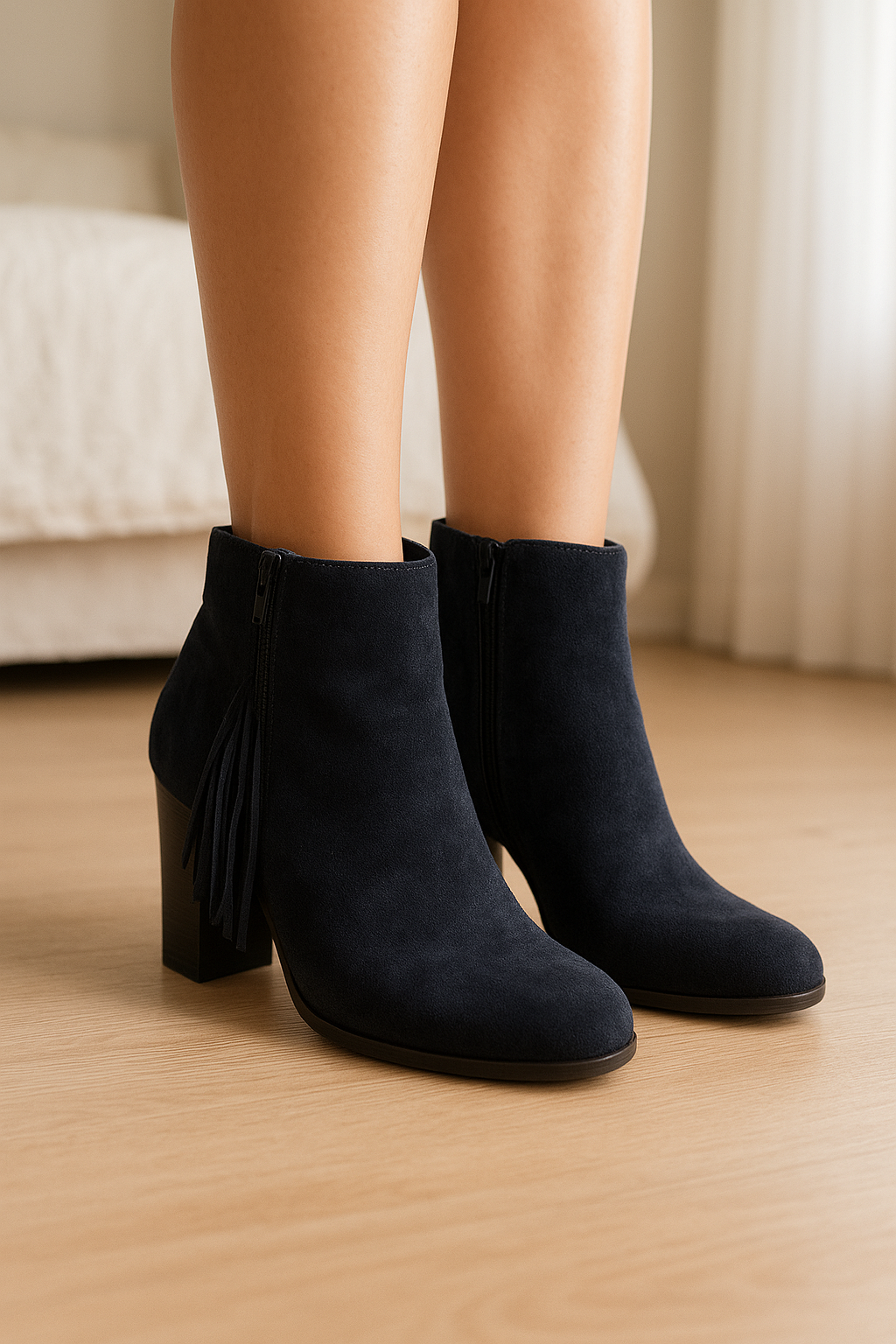 Bottines à talons bleu debout, face à la caméra, dans une chambre à la lumière douce, avec une lumière naturelle filtrant par la fenêtre.