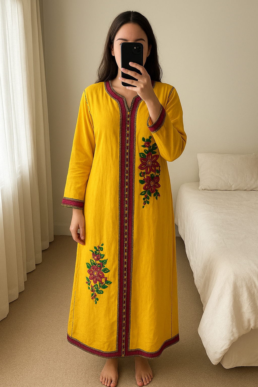 Caftan jaune avec motif fleur debout, face à la caméra, dans une chambre à la lumière douce, avec une lumière naturelle filtrant par la fenêtre.