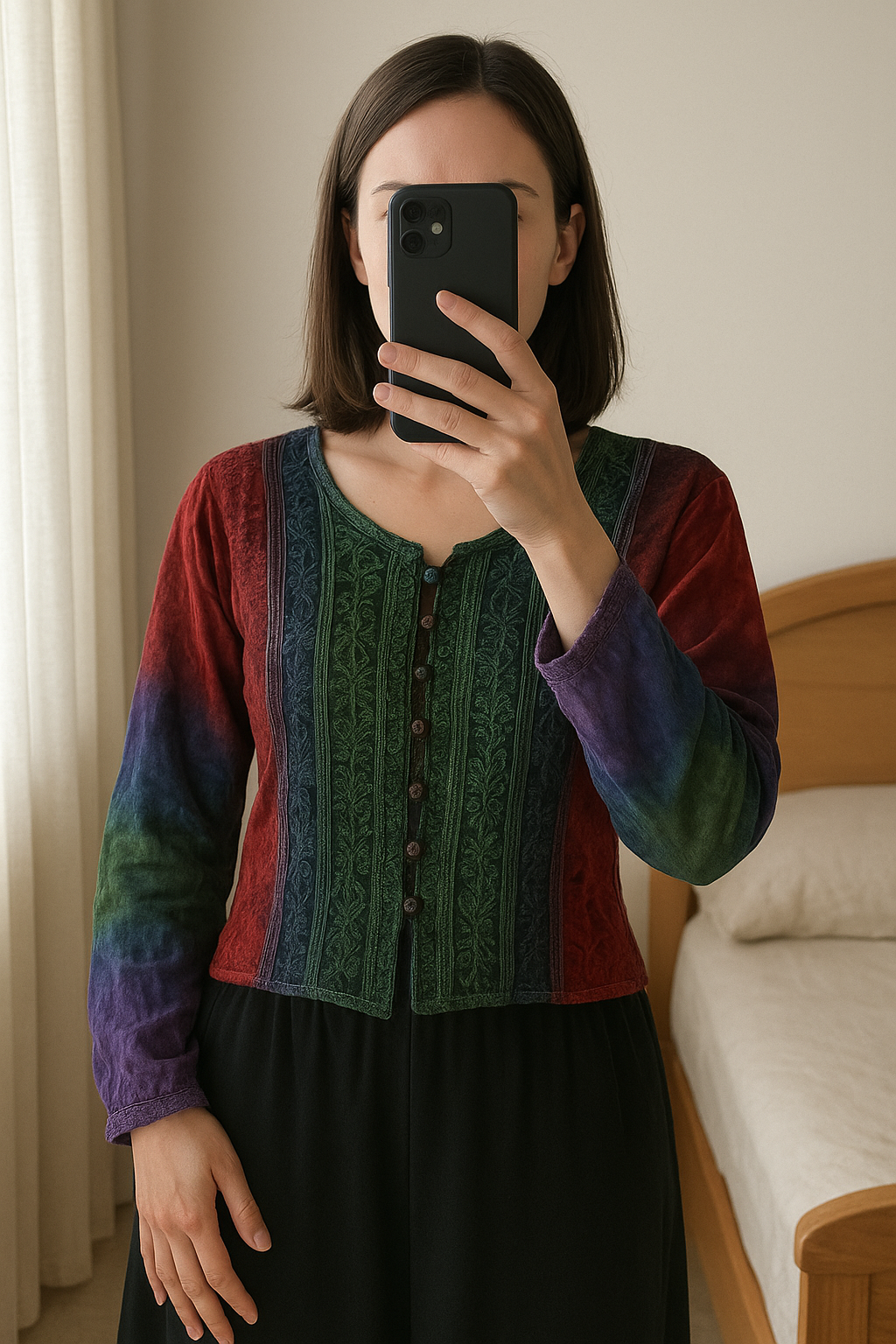 Camisa Blusa Oriental curta em pé, de frente para a câmera, em um quarto com iluminação suave e luz natural filtrando pela janela.