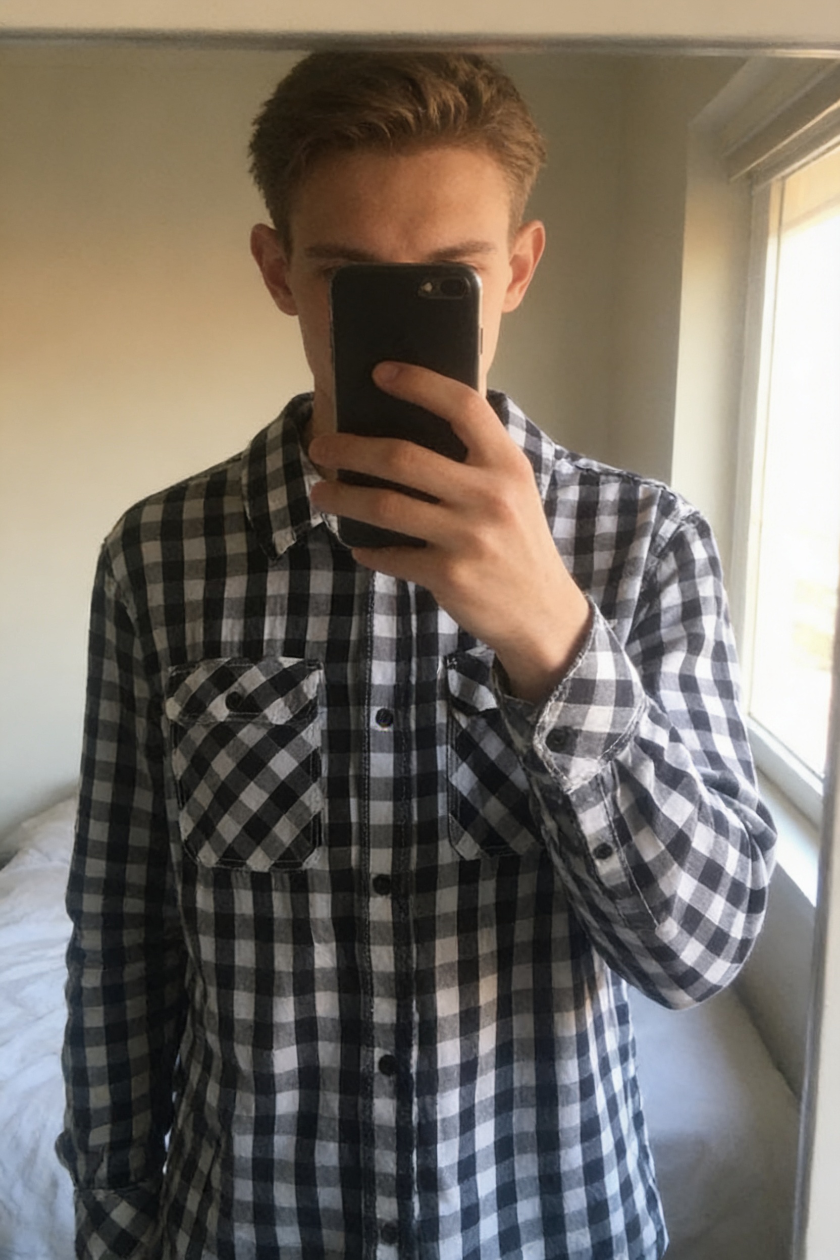 Camisa cuadros negro/blanco kiabi de pie, mirando a la cámara, en un dormitorio con luz suave y natural filtrándose por la ventana.