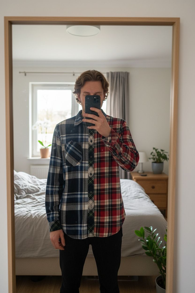 camisa hombe demin cuadros de pie, mirando a la cámara, en un dormitorio con luz suave y natural filtrándose por la ventana.