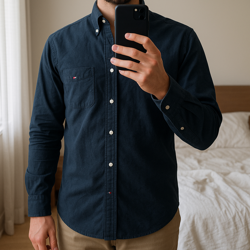 Camisa hombre Tommy Hilfiger de pie, mirando a la cámara, en un dormitorio con luz suave y natural filtrándose por la ventana.