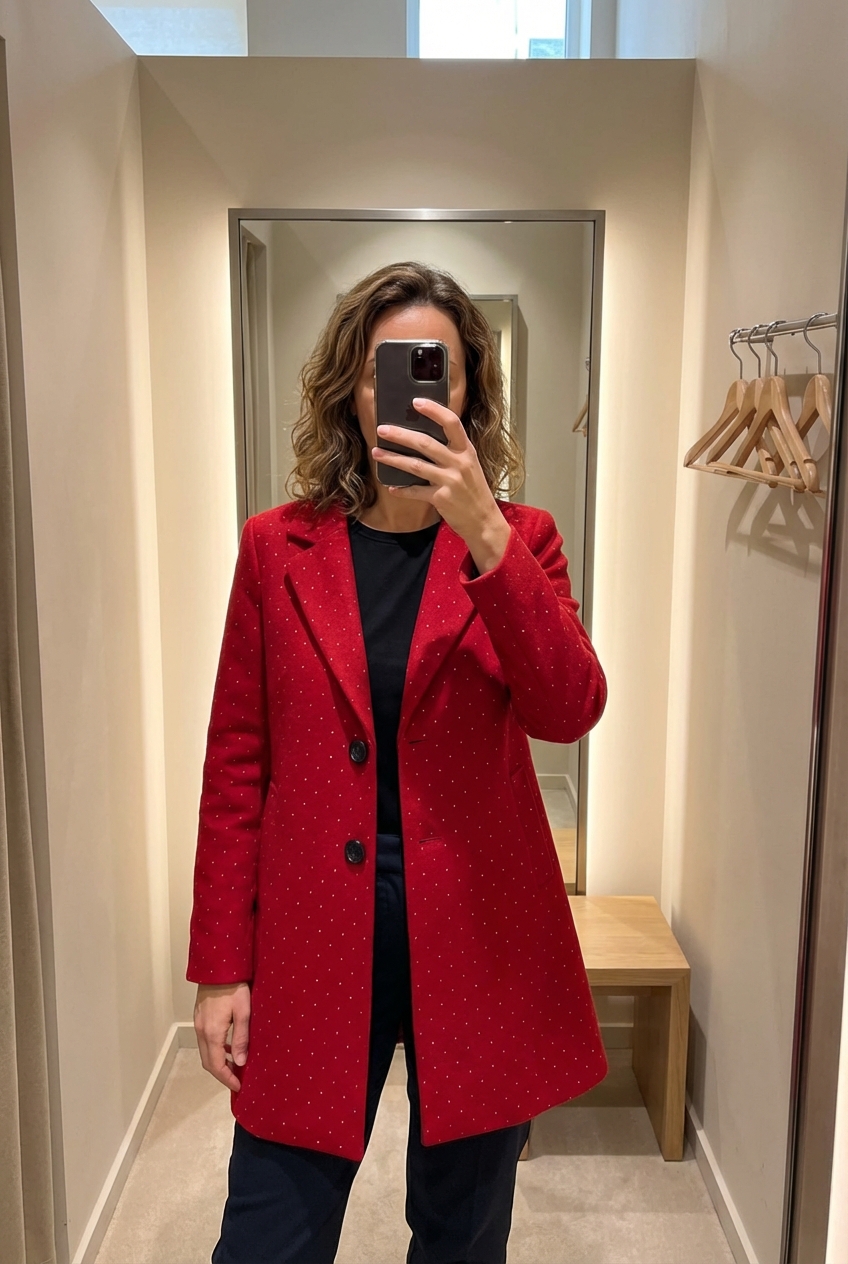 Una persona in Cappotto donna elegante rosso con micro pois luminosi Cod.3239 in piedi, rivolto verso la fotocamera, in un camerino in stile boutique con specchio e decorazioni neutre.