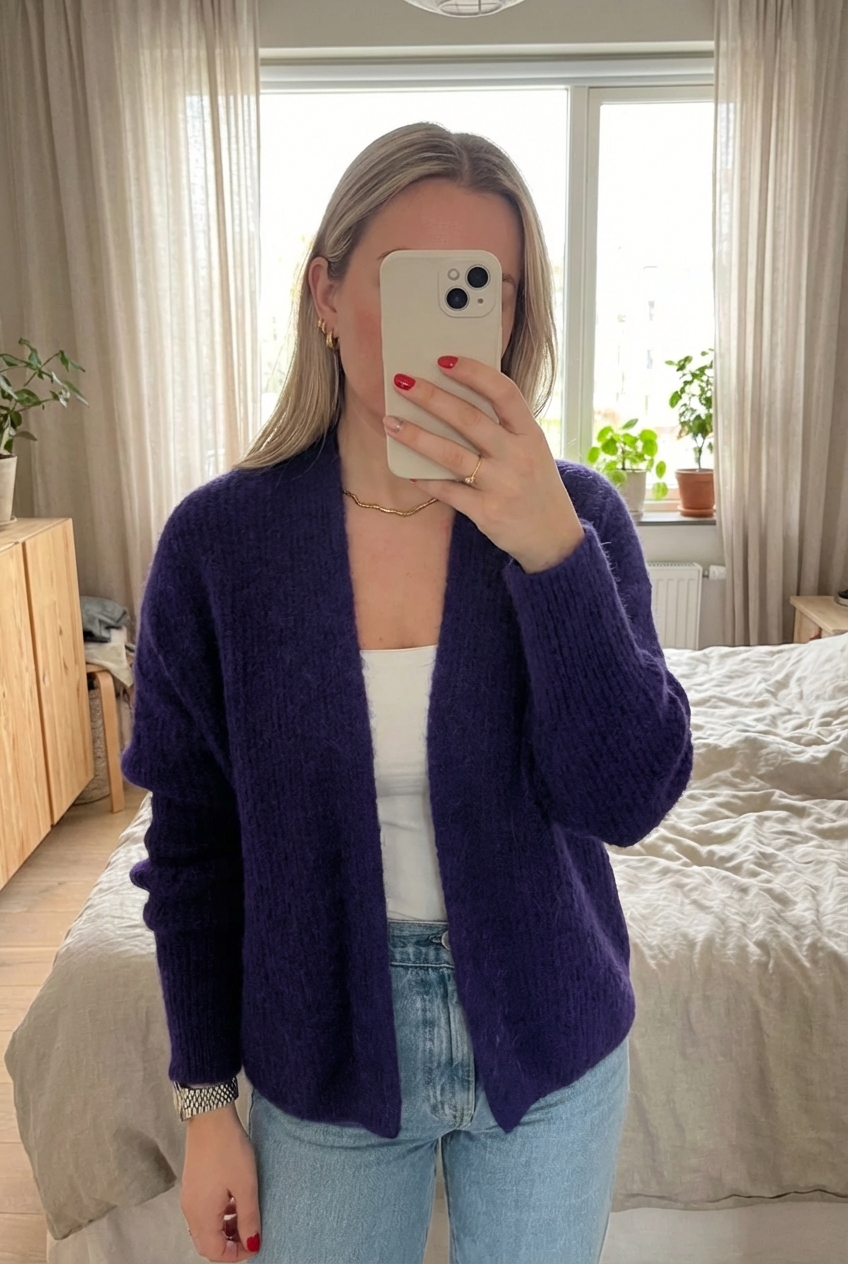 Cardigan American Vintage debout, face à la caméra, dans une chambre à la lumière douce, avec une lumière naturelle filtrant par la fenêtre.