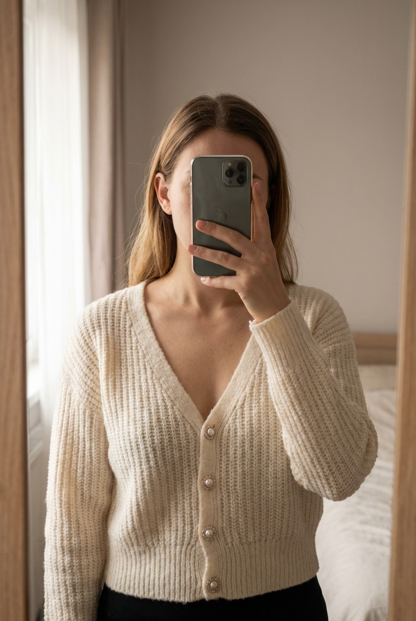 Cardigan blanc cassé + bouton perles debout, face à la caméra, dans une chambre à la lumière douce, avec une lumière naturelle filtrant par la fenêtre.