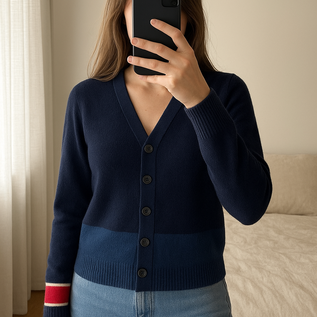 Cardigan Cachemire et Laine Tommy Hilfiger Bleu Marine S debout, face à la caméra, dans une chambre à la lumière douce, avec une lumière naturelle filtrant par la fenêtre.