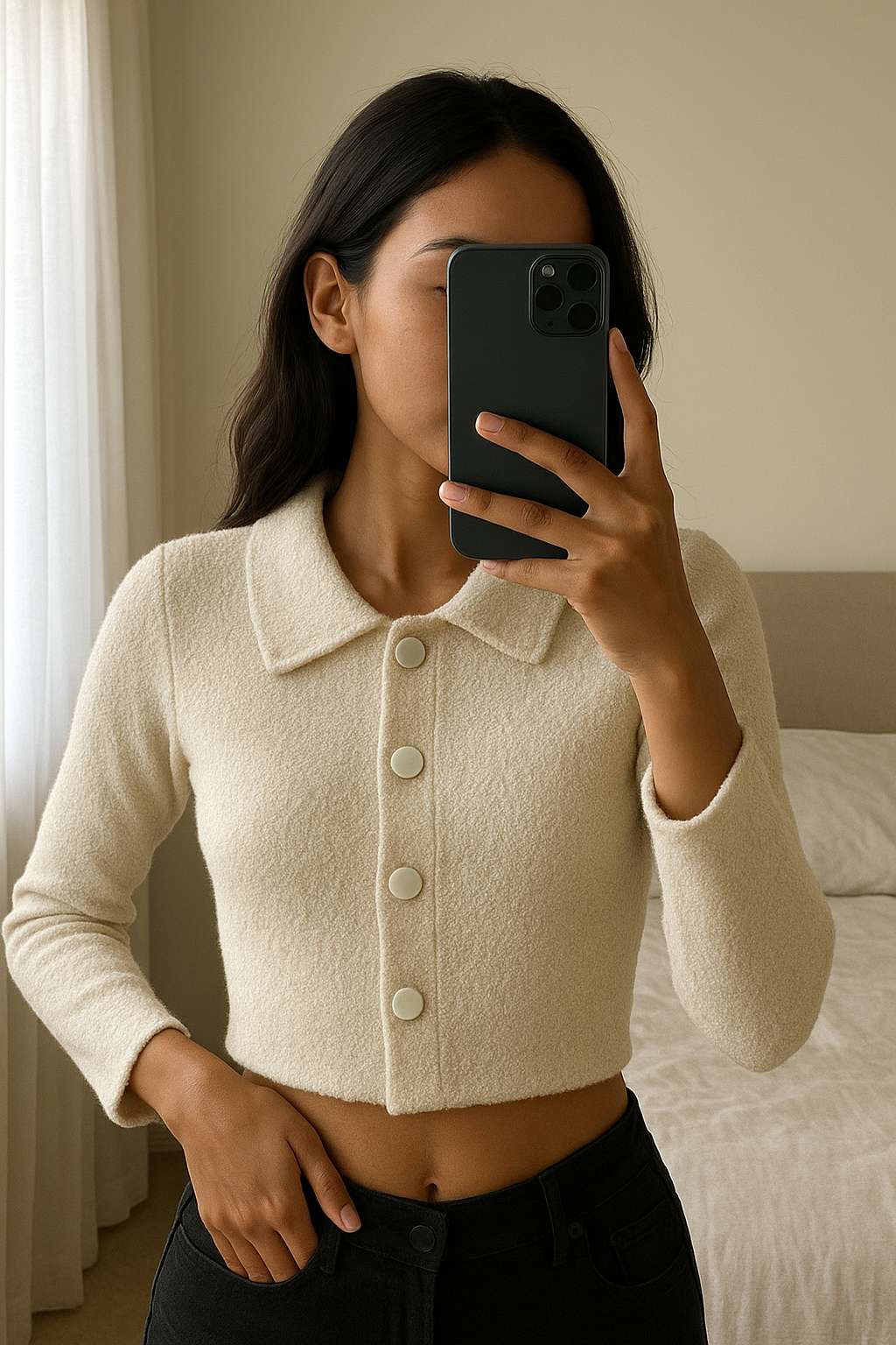 Une personne en Cardigan court claudie Pierlot ecru T34 cambrant légèrement le dos pour une pose dynamique, avec une silhouette fine, dans une chambre à la lumière douce, avec une lumière naturelle filtrant par la fenêtre.