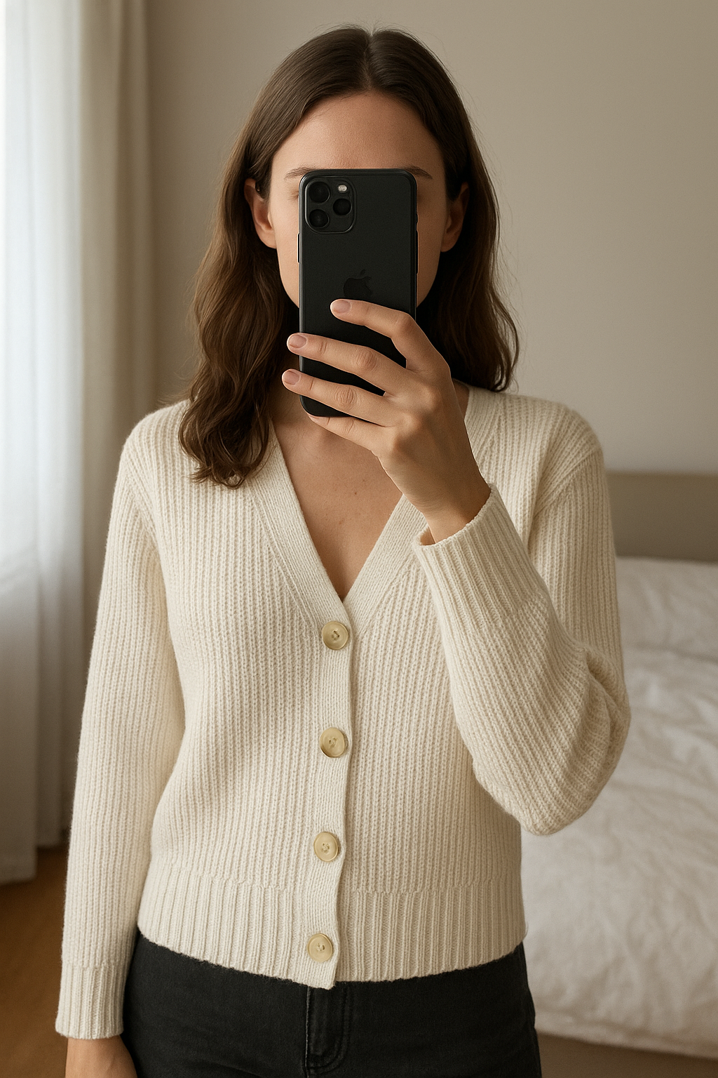 cardigan femme debout, face à la caméra, dans une chambre à la lumière douce, avec une lumière naturelle filtrant par la fenêtre.