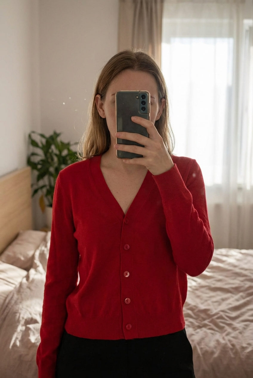 Cardigan Mango rouge debout, face à la caméra, dans une chambre à la lumière douce, avec une lumière naturelle filtrant par la fenêtre.