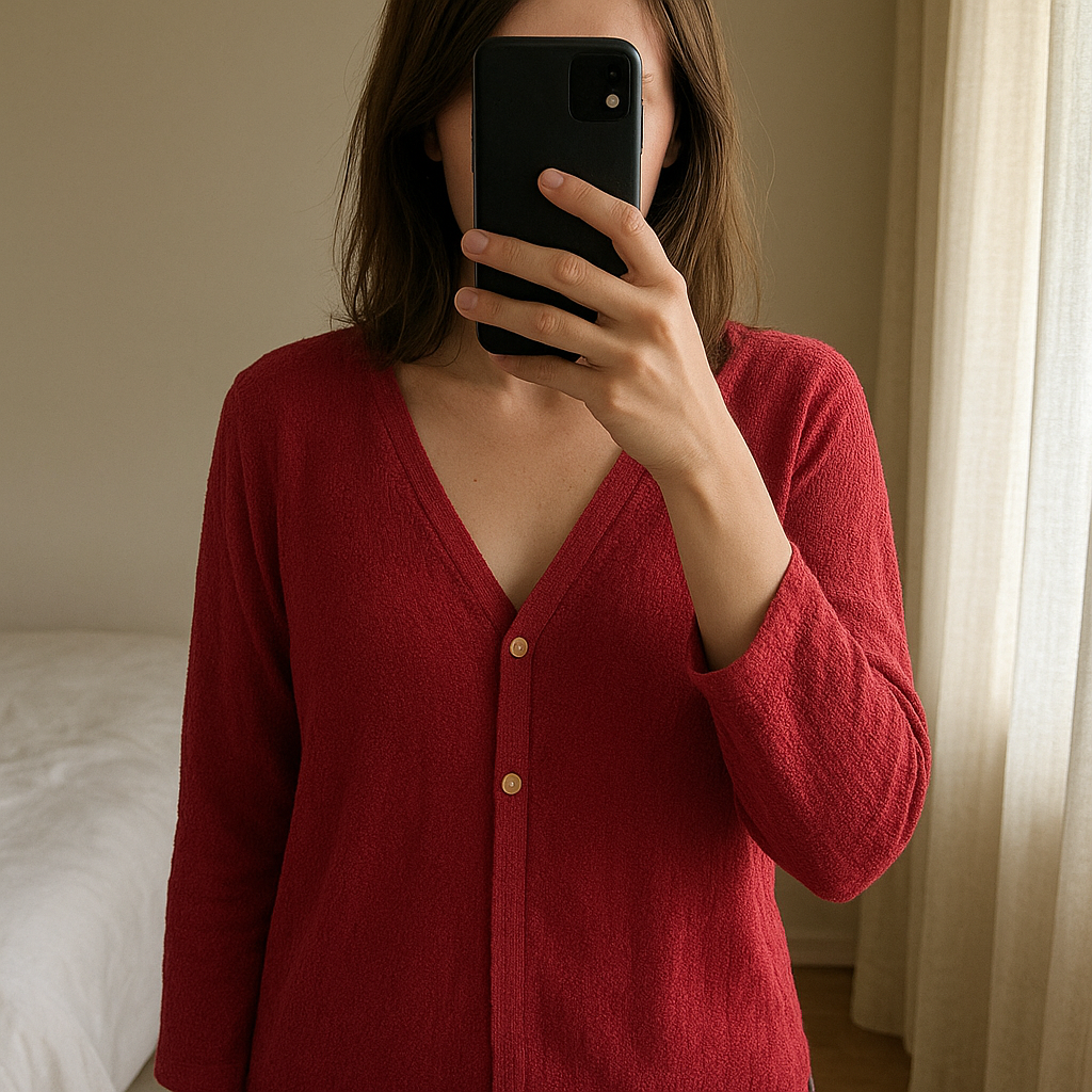 Cardigan rouge debout, face à la caméra, dans une chambre à la lumière douce, avec une lumière naturelle filtrant par la fenêtre.