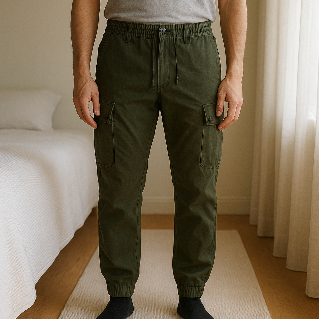 Cargo bizzbee taille 38 debout, face à la caméra, dans une chambre à la lumière douce, avec une lumière naturelle filtrant par la fenêtre.