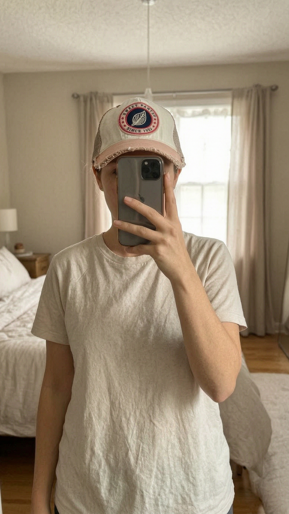 Casquette sweet pants debout, face à la caméra, dans une chambre à la lumière douce, avec une lumière naturelle filtrant par la fenêtre.
