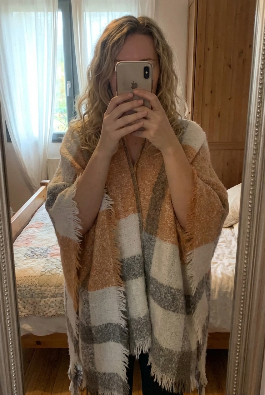 Châle femme taille unique debout, face à la caméra, dans une chambre à la lumière douce, avec une lumière naturelle filtrant par la fenêtre.