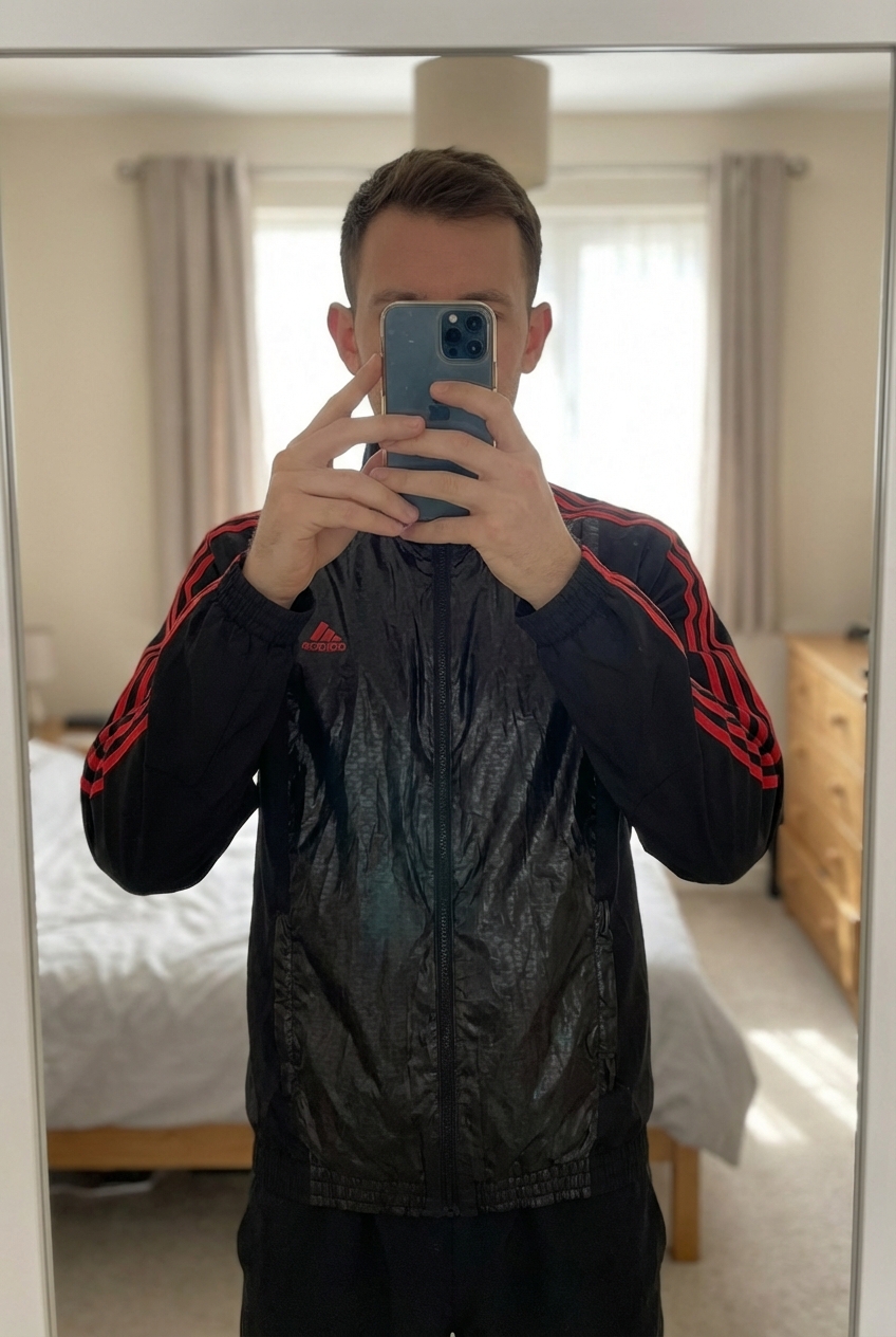 Chaqueta Adidas de pie, mirando a la cámara, en un dormitorio con luz suave y natural filtrándose por la ventana.