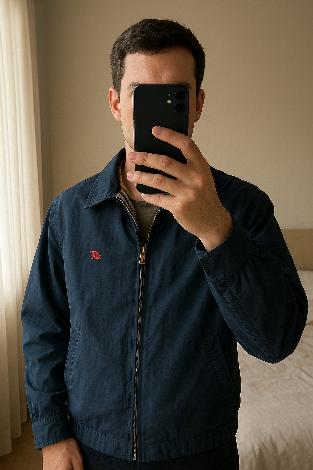 Chaqueta Burberry vintage Original para Hombre Talla [7] M/L de pie, mirando a la cámara, en un dormitorio con luz suave y natural filtrándose por la ventana.