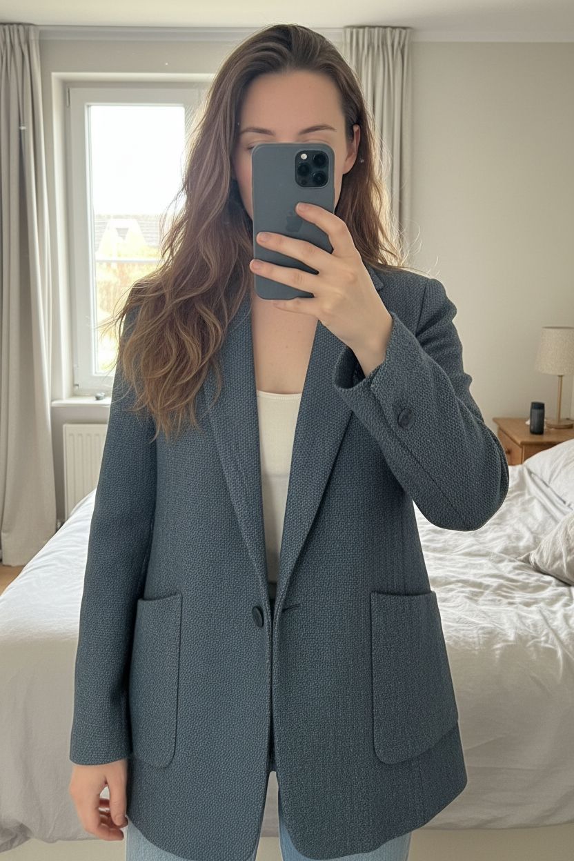 Chaqueta estilo americana de pie, mirando a la cámara, en un dormitorio con luz suave y natural filtrándose por la ventana.