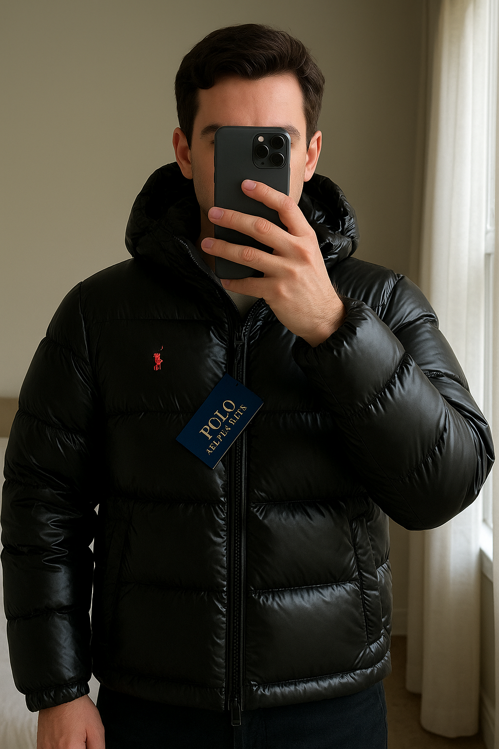 Chaqueta Ralph Lauren Talla S debout, face à la caméra, dans une chambre à la lumière douce, avec une lumière naturelle filtrant par la fenêtre.