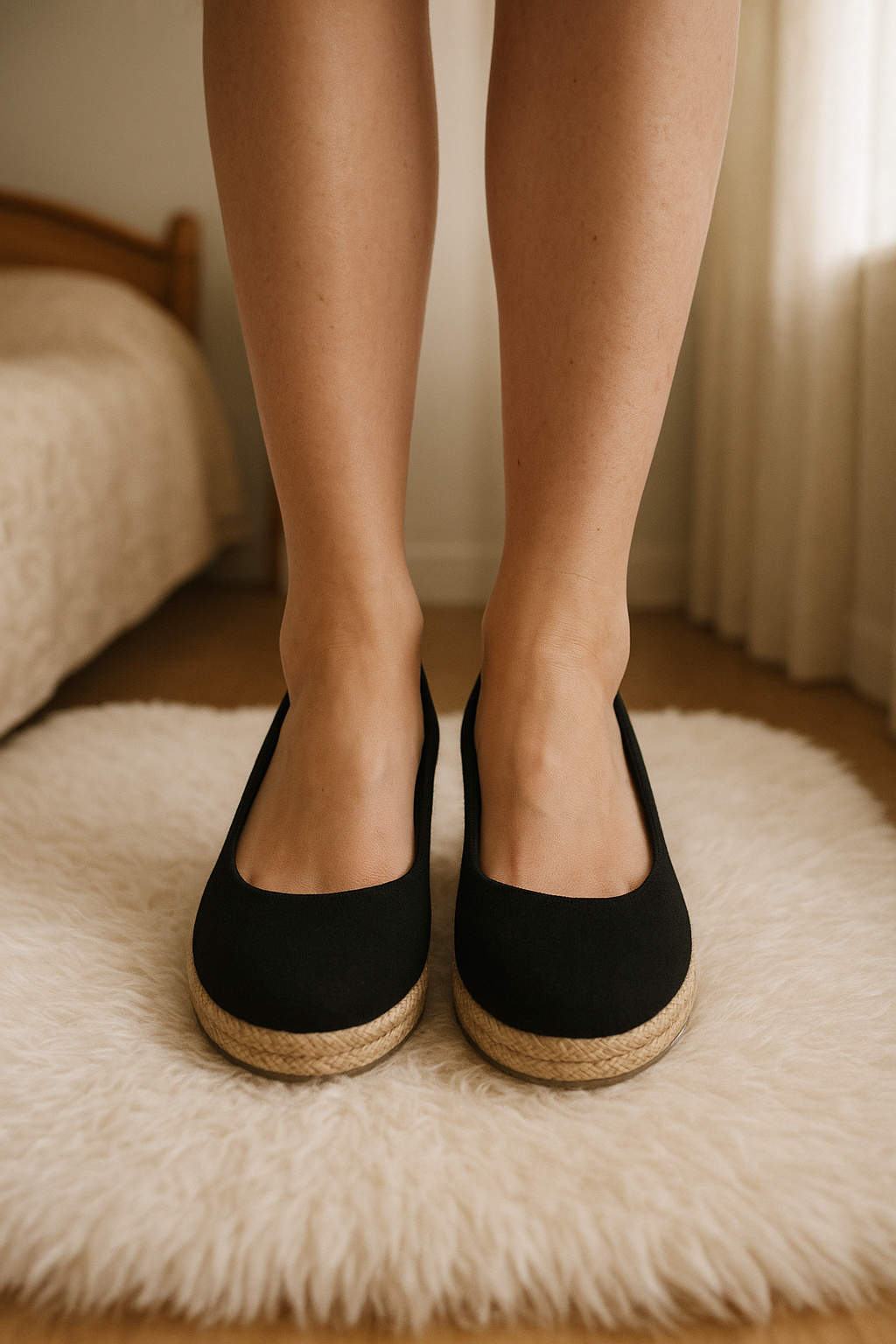 chaussure compensée noir - taille 42 debout, face à la caméra, dans une chambre à la lumière douce, avec une lumière naturelle filtrant par la fenêtre.