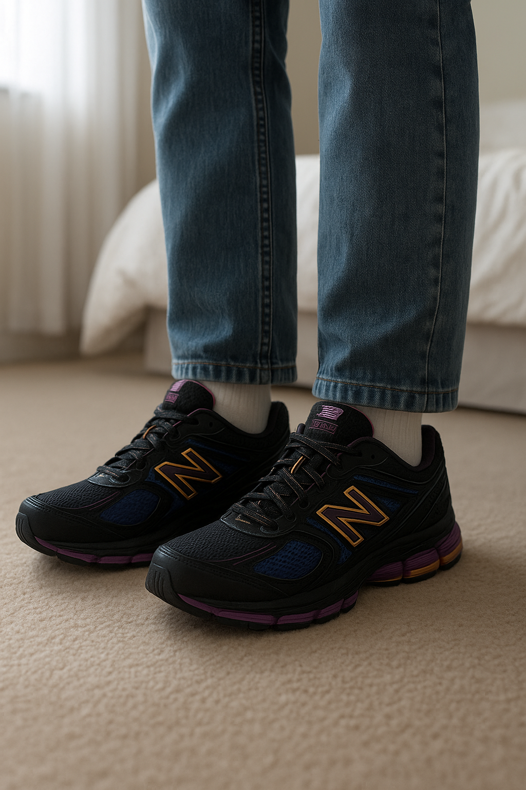 Chaussure neuf debout, face à la caméra, dans une chambre à la lumière douce, avec une lumière naturelle filtrant par la fenêtre.