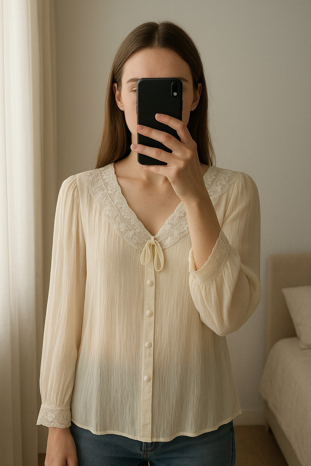 Chemise/blouse Naf Naf ivoire debout, face à la caméra, dans une chambre à la lumière douce, avec une lumière naturelle filtrant par la fenêtre.