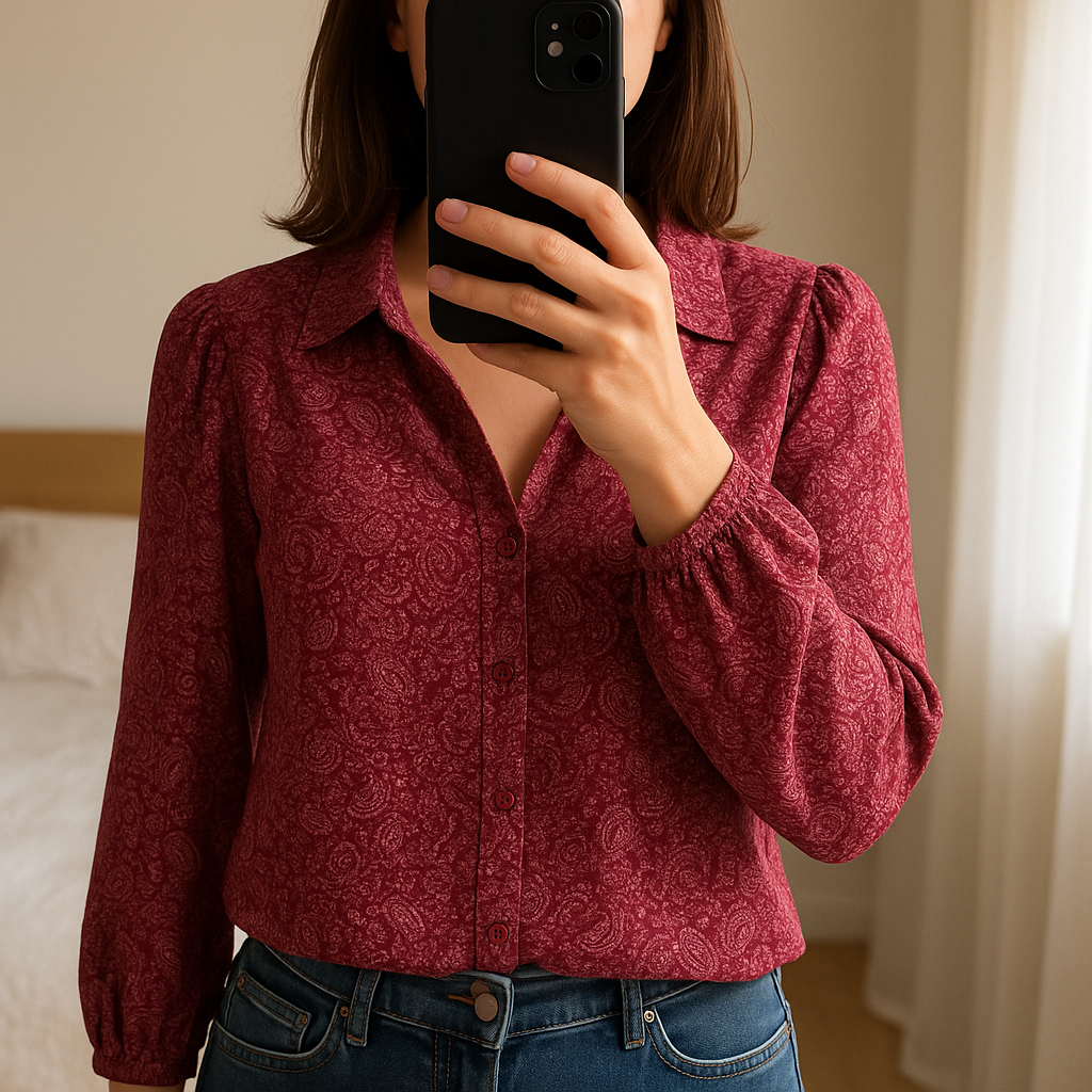 Chemise femme Gémo à motifs cachemire debout, face à la caméra, dans une chambre à la lumière douce, avec une lumière naturelle filtrant par la fenêtre.