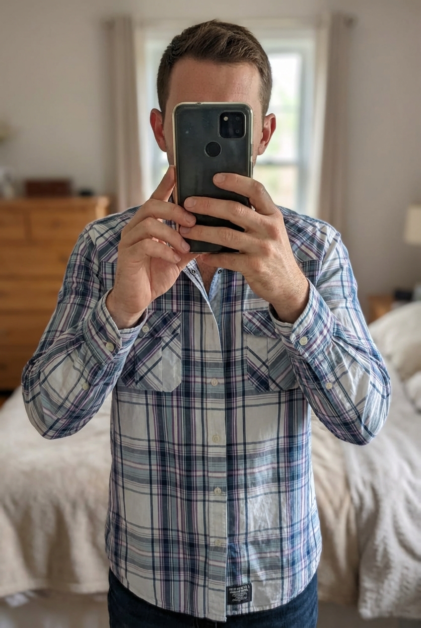 Chemise Homme debout, face à la caméra, dans une chambre à la lumière douce, avec une lumière naturelle filtrant par la fenêtre.