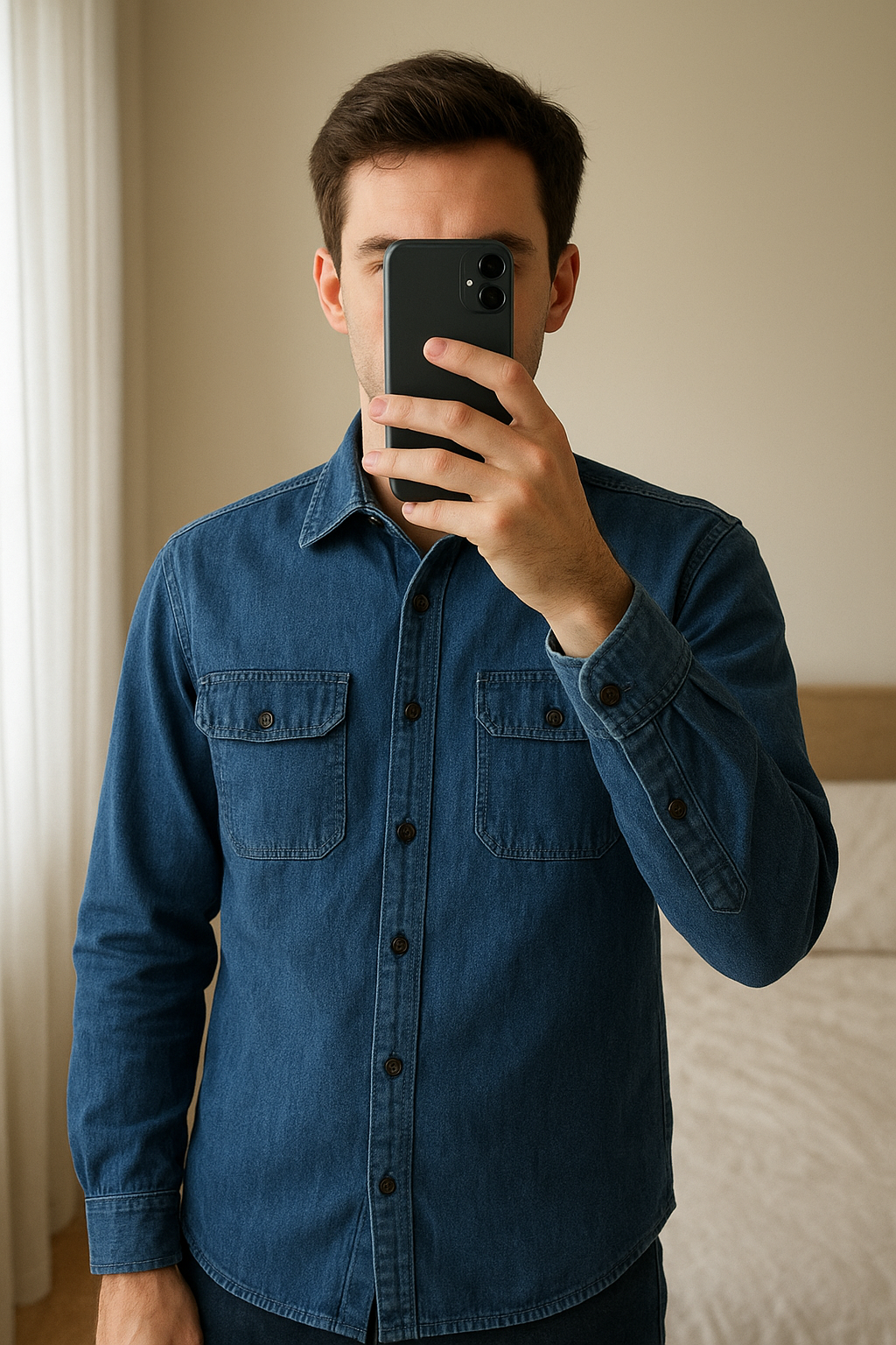 Chemise Jean Wrangler debout, face à la caméra, dans une chambre à la lumière douce, avec une lumière naturelle filtrant par la fenêtre.