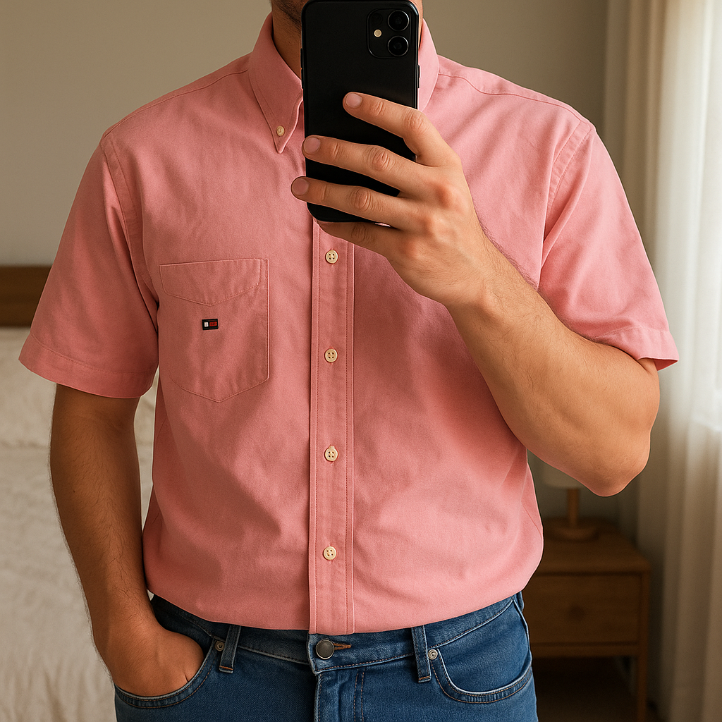 Chemise Manche Courte Tommy Hilfiger Taille XL Homme debout, face à la caméra, dans une chambre à la lumière douce, avec une lumière naturelle filtrant par la fenêtre.