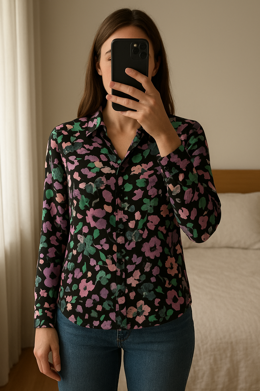 Chemise originale ICHI Taille S debout, face à la caméra, dans une chambre à la lumière douce, avec une lumière naturelle filtrant par la fenêtre.