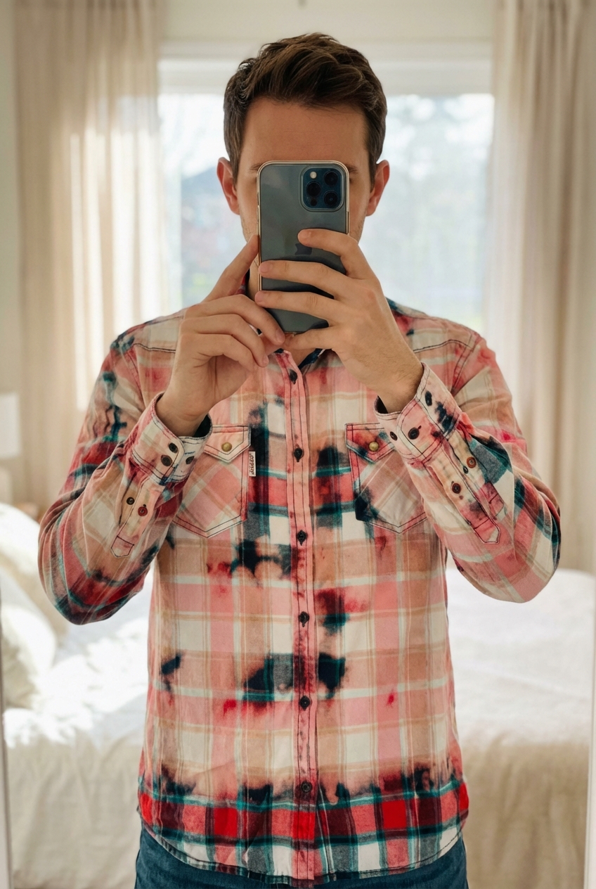 Chemise / Sur Chemise Guess Taille M - Ecossais effet Tie & Die - Slim Fit debout, face à la caméra, dans une chambre à la lumière douce, avec une lumière naturelle filtrant par la fenêtre.