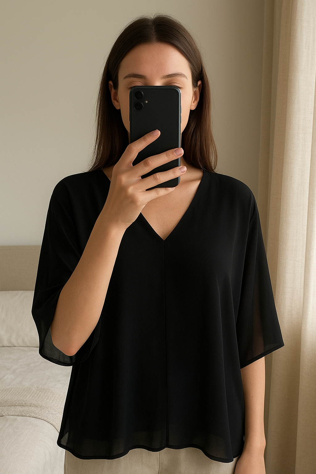 Chemisier femme debout, face à la caméra, dans une chambre à la lumière douce, avec une lumière naturelle filtrant par la fenêtre.