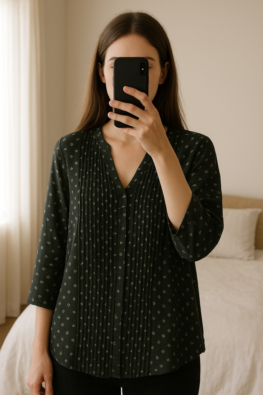 Chemisier H&M 🍃 debout, face à la caméra, dans une chambre à la lumière douce, avec une lumière naturelle filtrant par la fenêtre.