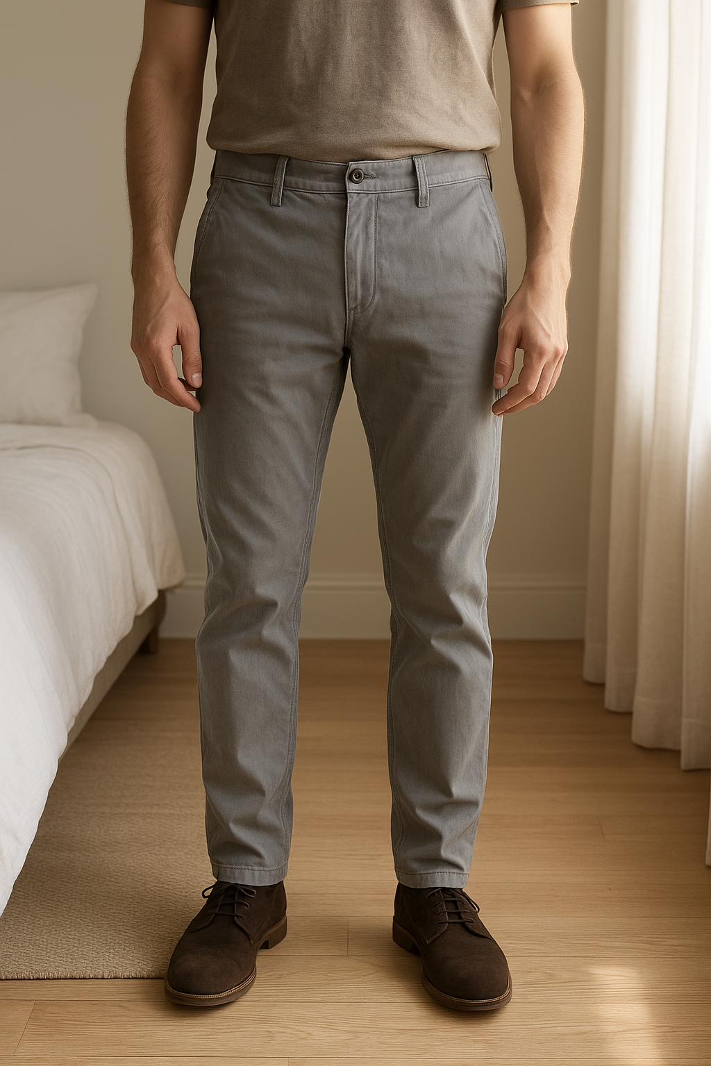 Chino basic debout, face à la caméra, dans une chambre à la lumière douce, avec une lumière naturelle filtrant par la fenêtre.