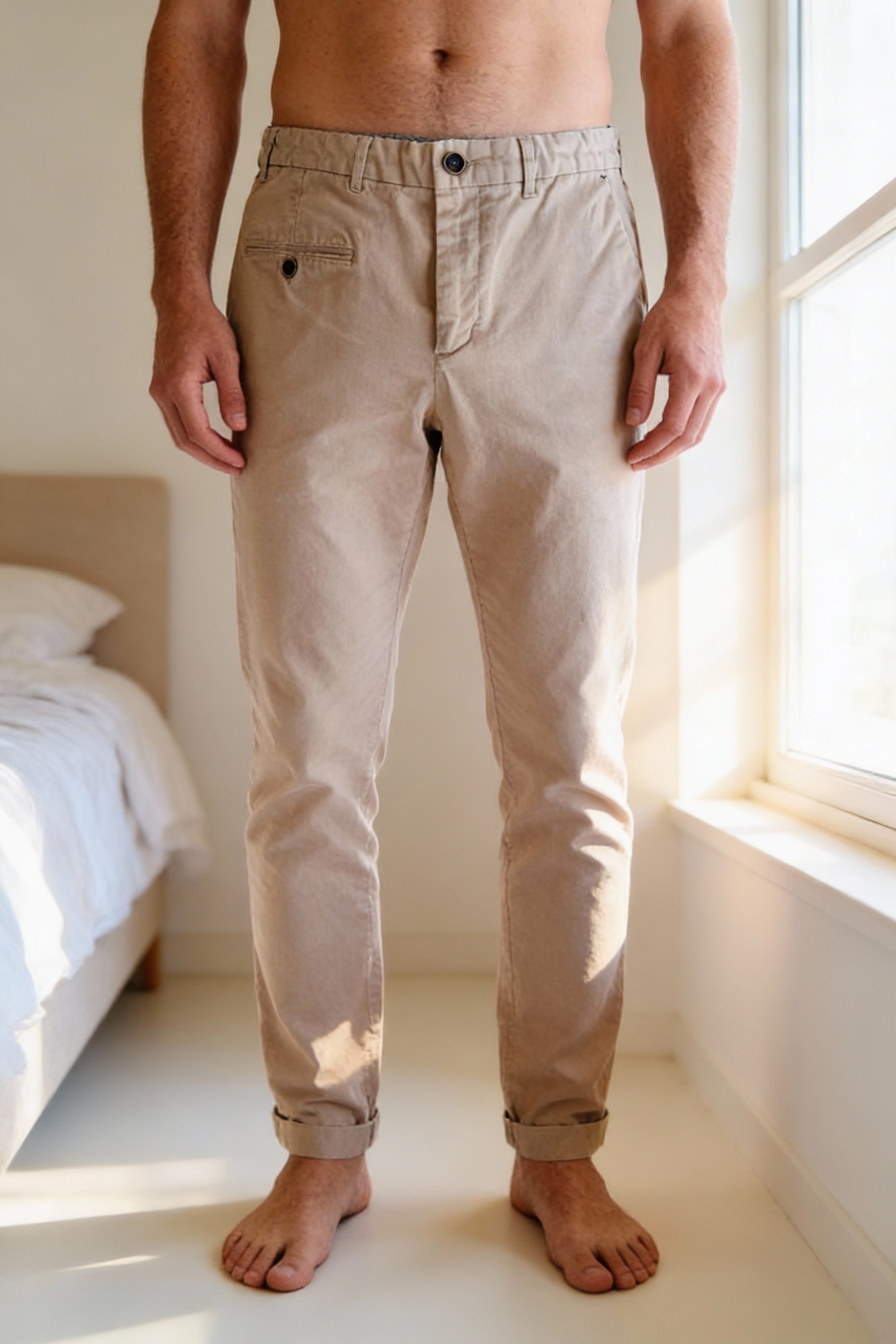 Chino Devred Beige Slim Fit debout, face à la caméra, dans une chambre à la lumière douce, avec une lumière naturelle filtrant par la fenêtre.
