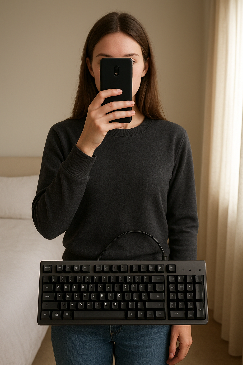Clavier Logitech G413 Carbon debout, face à la caméra, dans une chambre à la lumière douce, avec une lumière naturelle filtrant par la fenêtre.